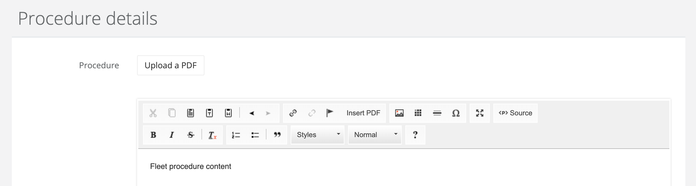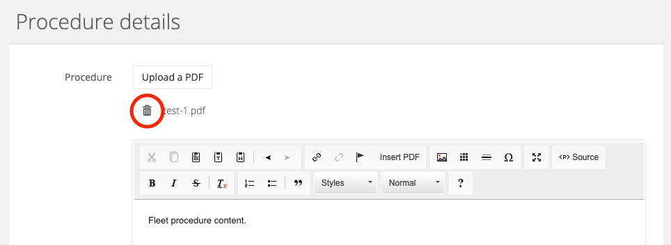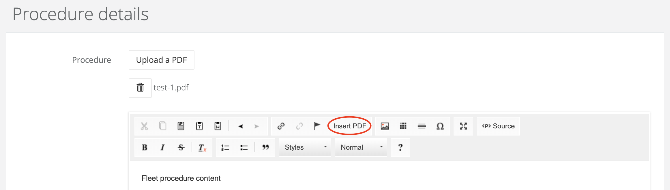 - Scroll the Procedure details section and click in the Insert PDF button in the WYSIWYG toolbar: