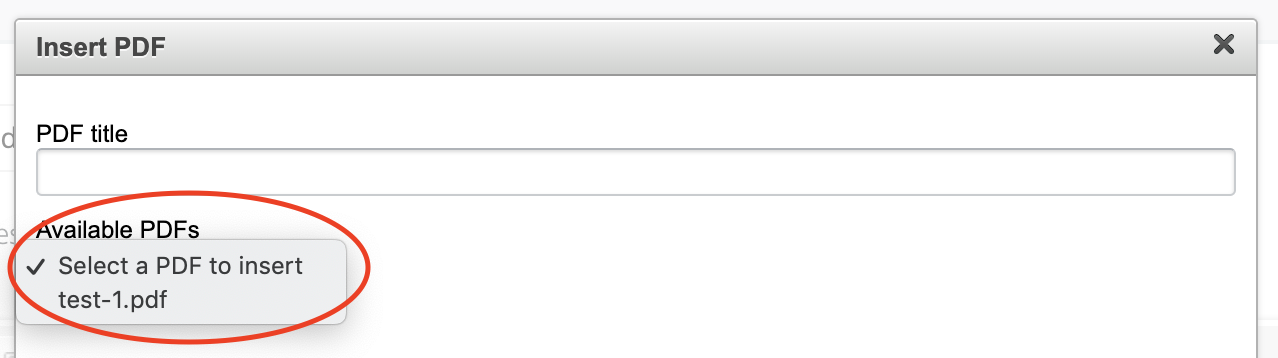 - In the Insert PDF modal that appears, choose the PDF you'd like to link to from the Available PDFs select list: