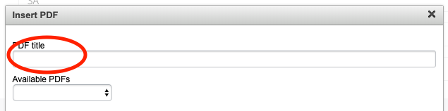 In the Insert PDF modal that appears, provide the text for the link text that will appear in the procedure in the PDF title text field: