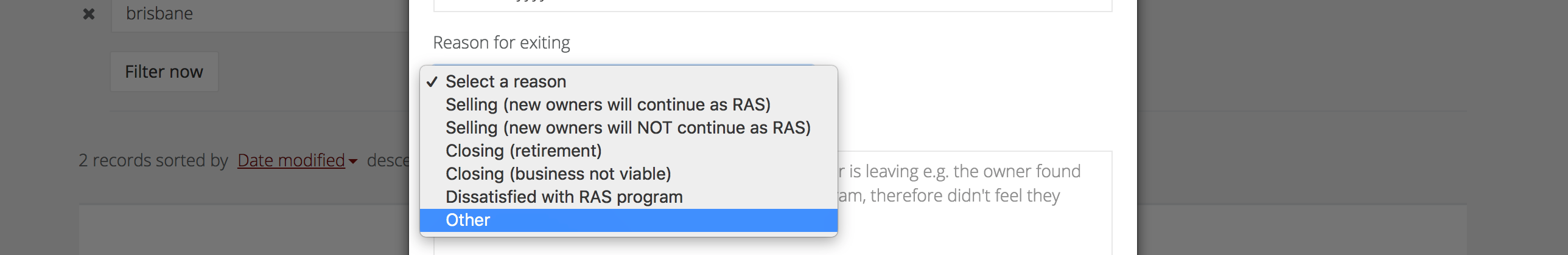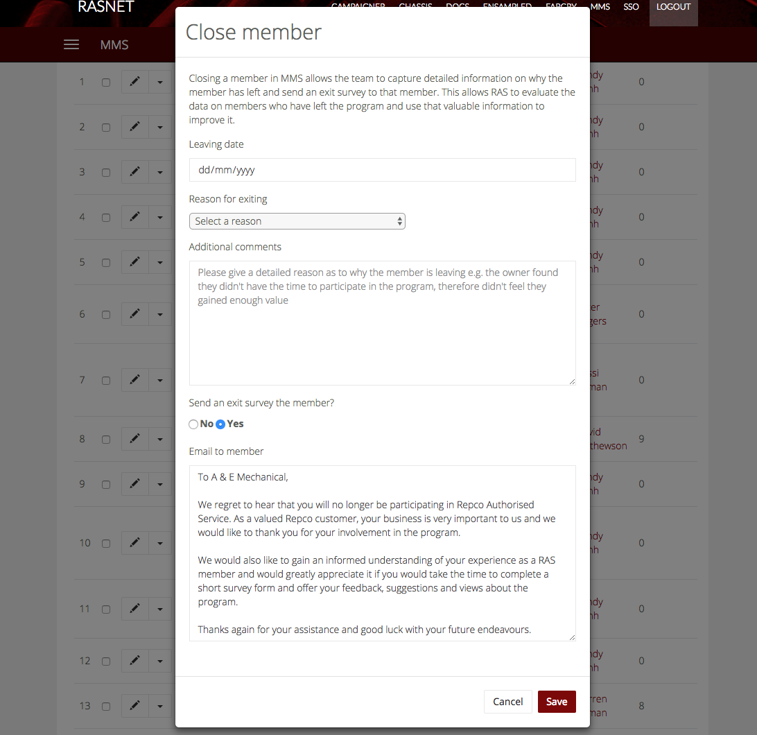 - Select the leaving date. This can be a date in the future. If it is, the member will remain active until that date at which point MMS will automatically make them inactive. When members are made inactive, emails are automatically sent out to the wider team who support the RAS program notifying them a member was closed.