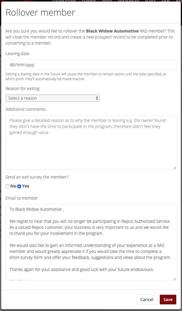 - You can also send an exit survey to the member. In most instances, a survey should be sent. You can alter exit email content if required. This email will contain a link to an exit survey to gather more information from the exiting member. A copy of the email will be sent to the person closing the member and the outgoing member themselves. The results of this survey will be emailed to the National Manager.