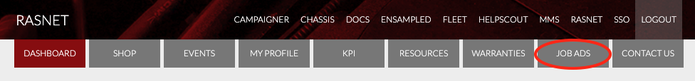 A member will create, edit and delete job advertisements in RASNet. To do so, the member should click on the Job Ads navigation item: