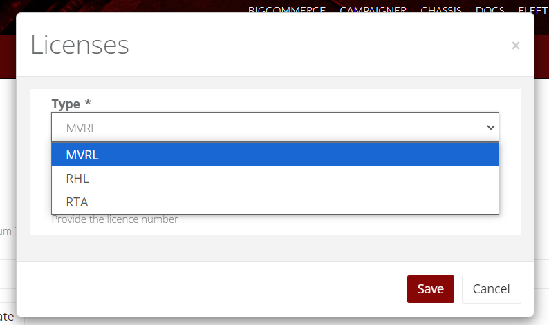- Select the licence "Type" from the dropdown menu.